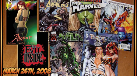Amour & The Evil Inside ~ Approbation Comics sent me these PDFs as a thank-you for my reviews of their earlier comics (buy Chaos Campus!), so I thought I'd review them too - they're not especially super-heroine-y, but hey, it's my site, I can do what I want. Normally I'm a bit wary of anthologies, in comics and elsewhere, since they're usually a bit of a bell curve, with some good, some average, and some bad (I'm looking at you, Marvel Comics Presents), and I prefer aiming for all-good to begin with. These aren't subject to that rule, since they're all the work of the same writer, and unlike the ill-fated MCP, the shorts contained in each issue are meant to be short stories, rather than drawn-out serialisations of longer ones. As the titles will probably tell you, Amour is all about romance in its various forms, while The Evil Inside is a collection of horror stories, touching on the supernatural but not in an overt Spawn/Ghost Rider/name-your-demons-vs-angels-story kind of way - it actually put me in mind of that old Nightmare on Elm St series, where Freddy was the presenter for various non-Freddy-related short stories (probably based on earlier TV shows, but let's pretend I'm not old enough to know), and issue #3 is shared between the two. The art is black and white, but well-drawn, and as I said all the writing is by the same hand, so the quality level is consistent, rather than good stories being paired with crud just to make up the page count. As I said, anthologies aren't my thing, but if either of these concepts sparks your interest - especially the romance one, which isn't something you see a lot of in western comics these days - these could be worth your time.