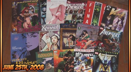 New Avengers #42 ~ Another fill-in-the-backstory Secret Invasion tie-in, but when you've got a formula that works this well, why change? This time we see a big slice of recent Marvel history from the point of view of Spider-Woman, who (we know by now, but this confirms it) was replaced by the Skrull Queen. The formation of the New Avengers, the SHIELD rogue faction stuff, and the lead-up to House of M all feature in what would be a spectacularly ballsy retcon, except that Bendis really did plan this all along. The audacity of it is breathtaking at times, and you laugh in sheer admiration for what they're doing - and it's doubly impressive in today's age of comics, where six issues is a 'run', and this kind of years-long story is a rarity. The only thing that confuses me - were they really giving Jessica a boob job at the same time as restoring her powers? Because on the operating table she doesn't look that chesty - yes she's lying down, but even so - and there's a couple of silvery blobs among the instruments. It's a weird in-joke, if that's what it is. Anyway, boobs aside, this is another worthwhile tie-in - if you're buying Secret Invasion, and know the history of the Avengers for the past few years, you don't want to miss this.