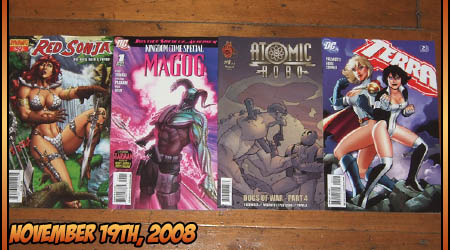 Terra #2 ~ Alright, let's get this out of the way: this issue features some of the most laughable eye candy I've ever seen, in the opening sequence where Terra wakes up and dons her costume. It looks like it's derived from the amusingly titillating bit reprinted in the Power Girl trade paperback, where Kara likewise dons her uniform after a medical exam, but it's just so overdone here that it's actually a weakness. Amanda Conner knows how to titillate with skimpy costumes and interesting poses - she does it often - but this level of would-be eye candy just drags the whole thing down to the level of Austin Powers farce. I buy Tarot: Witch of the Black Rose every two months when it comes out, I know what comic book nudity looks like - DC's not getting any points for this half-assed attempt at it. That aside - and I'm not just carping on about it, it really did make this issue difficult for me to engage with, since the first impression I got was "Hey reader, you're an idiot, so this should entertain you," - the use of Power Girl as a touchstone character was useful, since it gave me someone to side with while I waited for Terra to start making sense, or at least for some explanation of who she is and what she wants to turn up. But that aside, what I'm getting is something disturbingly similar to the Batgirl miniseries, which you may recall I gave up on - same reason, too much time taken up with meaningless fights, not enough storytelling, and what there was of a plotline was too wrapped up in its own backstory. I didn't buy this because I desperately wanted to see the latest chapter in the history of the Terra name, and how this girl will fit into the 'family' of Geo-Force and the previous Terra and so on - I just wanted a story about a new superheroine. This isn't a bad comic, but it feels like it doesn't want to just be a story in itself - it seems like there's a cringing inferiority complex making it cower beneath the protection of already-established continuity, instead of just telling a new story. I'm not hugely entertained by that.