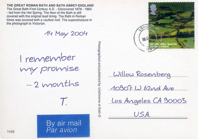TARA IS COMING TO SEE ME THIS SUMMER! I'm hyperventilating, Buffy. Tara...here...with me...for TWO WEEKS! She used the money from her job at the Tate Gallery. She's flying in when neither of us have classes. Buffy, what am I going to wear?! Help me! I need to go lay down - I'm dizzy. I'll call you soon. Love, W | ||||||||
