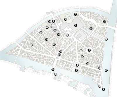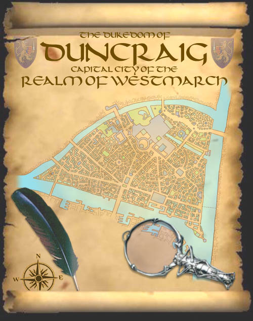 Note: This is a map of the city of Duncraig, at the junction of the Marien and Kingsway Rivers. The city proper extends for many miles in every direction, with a total population in the region of one and a half million people. This map shows the centre of the city, now commonly called the 'Royal Isle', bordered by both rivers and an off-shoot of the Marien; this was the site of the original founding of the city, and continues to be its heart, and the site of its most important landmarks. These include the Ducal Palace, the Parliament, the College of Mages, and the Market Hall.