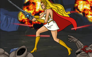 A new sound drew her attention, and she looked across to see the transport aircraft lifting off its pad, turning in mid-air to face the raging battle. She wanted to shout a warning to She-Ra, but she saw it was unnecessary - the tiny, shining figure was already ducking behind a building, cutting off the aircraft's view of her as she tore her way through the troops waiting there. The transport gunned its engines, rising higher, but before it could climb far She-Ra stepped into the open, took hold of the barrel of a battle tank, and hurled it with all her strength into the air before again running for the cover of a building. The transport fired point-blank, blasting the tank to pieces, but it almost crashed itself as flaming debris rained onto it, forcing it down. Willow let out a gasp of relief - but then the transport fired again, cannons and missiles slamming into the buildings She-Ra was using for cover. Willow felt herself cry out, but the detonations were loud enough to mask her yell. She-Ra was thrown to the ground, tumbling over and over and finally smashing into a steel barrier wall, crumpling to the ground. "Get up," Willow whispered desperately. Seeing the Hordesmen's attention fixed on their target she broke cover and sprinted nearer, finding shelter in the shadow of one of the mangled heat beam turrets. Her heart started beating again when she saw She-Ra scramble to her feet, but her elation was cut short as the ground around her began to be churned up by fire from dozens of cannons. Robbed of cover, she ran desperately, straining to stay ahead of the withering hail of fire. The transport loomed closer, firing more missiles - She-Ra leapt aside to avoid the worst of their blast, but found her avenue of escape cut off. The transport's guns opened fire, trying to force her back, while troopers closed in from behind her, the battle tanks levelling their cannons at her. In desperation she sprinted forward, vaulted atop a ruined tank, then to the edge of a building's roof, and launched herself into the air, straight at the approaching aircraft. It fired again, and She-Ra swung her sword, catching the oncoming missile and slamming it aside, but its blast caught her and she tumbled through the air, almost missing her target. She reached out and caught a railgun barrel as she fell, swinging herself up onto the craft's hull and raising her sword. From somewhere on the ground a squad opened fire, their shots slamming into her stomach, making her stagger, but she recovered and brought her sword down, tearing into the aircraft. It lurched out of the air, dipped sideways, and crashed violently into the buildings beneath, throwing She-Ra again into the open as its engines exploded in a hail of whirling shrapnel. Before she could do more than stagger to her feet a trail of railgun fire caught her in the back, pushing her forwards. She lurched, caught herself from falling, but then had to dodge as a squadron of tanks rounded a corner and opened fire. Before she could recover another squad of troopers fired, hitting her dead on, throwing her back to the ground. The railguns fired again as she got to her knees, hammering her back, almost forcing her back to the ground. Slowly, with rounds slamming into her from every angle, she struggled to her feet and began to run, stumbling and dodging as best she could. Willow felt her heart break, unable to believe what she was seeing. She-Ra swung her sword, knocking away a tank shell, only to be struck from behind by another, hurling her across the open ground. More and more turrets and troopers were Ignoring the pain from the heated metal burning her, blistering the palms of her hands, Willow clambered up onto the wreckage of the tower in front of her. She dropped to the ground on the other side, clear of the perimeter's razorwire, and scooped up a rifle lying next to a wrecked trooper, its metal hand still clutching the grip, severed at the wrist. Taking unsteady aim with the unfamiliar weapon she fired, ignoring the attention she was drawing to herself, concentrating on nothing but clearing a path for her Tara to escape. Caught by surprise the first ranks of troopers Willow shot fell quickly, their comrades briefly confused as to the source of the new attack. As they faltered Tara rose, charging forward in the sudden confusion, slashing at the troopers with her sword, striking them with her bare hand, kicking and ramming.