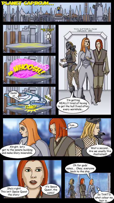 Planet Capsicum Tara looked out of the airlock warily. "Okay, I think we got it right this time," she allowed. "Tattoo, keep the engines running in case we need to make a quick getaway." Willow and Buffy followed her out onto the landing pad. "Why'd we have to leave so quick?" Buffy wondered. "Think how long it took to draw and colour that one page," Tara pointed out. "If we stayed a comic, this chapter would be even later than it is already." "I wouldn't have minded staying there a bit longer," Willow grinned. She added, whispering in Tara's ear: "Your bottom is really cute." Tara blushed, and bumped her hip into Willow's "I never realised how much I'm wearing practically nothing!" Buffy complained. "Mum was right all those times she told me I wasn't allowed to go out looking like this... who knew?" "So, how come you're out, looking like that anyway?" Willow asked. "Uh, invisibility field?" Buffy said. "Makes it kind of difficult to ground me. So, this is Capsicum, huh?" She looked around at the horizon-to-horizon city. "Is there a planet somewhere underneath all this, or it is just skyscrapers all the way through?" "No-one knows," Willow replied, while Tara flagged down a taxi. "They sent an expedition down to the lowest basement anyone could find last year to figure it out." "And?" "Their last transmission was 'My god, it's full of Starbucks,' then they were never heard from again."  Planet Capsicum The trio made their way stealthily through the throng of senators, aides, sycophants, and assorted hangers-on. Luckily the escorts on the arms of most of the senators were exotic enough that no-one paid the three of them any attention. Until someone shouted at them at the top of her lungs. "Willow! Tara! Uh... scantily-clad stranger!" "Oh no," Willow shook her head, as Faith elbowed her way through the crowd, wearing a Navy uniform that had been substantially cut down from its original size. "We're trying to be inconspicuous. We were trying, I should say." "Oh, sorry," Faith shrugged. "No biggie... Hey, everyone! Get a load of these!" The pirate turned back to the crowd and pulled her top down. "How does that help?" Tara asked sceptically. "They're not looking at you anymore," Faith grinned. "How've you guys been? Who's the blonde? You promised if you were gonna have a threesome it'd be with me!" "No we didn't!" Willow exclaimed. "You did in my imagination," Faith smirked. "I'm Buffy," Buffy introduced herself. "Saviour of the Universe." "Does it need saving?" Faith asked. "Well, yes-" Tara said. "And I'm the girl to do it!" "-but only coincidentally. What are you doing here? We left you half way across the galaxy." "Are you kidding?" Faith laughed. "The amount of time it took for you to get to this chapter, I've been from one side of the galaxy to the other, and added another digit to the number of people I've slept with." "That's... great, Faith," Willow sighed. "But we kind of need to be low-profile here..." "Oh, sorry. I'll ditch the uniform, it's probably drawing attention." "Is she always like this?" Buffy asked, as Faith quickly disrobed in front of everyone. "We haven't really known her that long," Tara shrugged. "But the smart money is on 'yes'," Willow added. "I'm not so familiar with the upper echelons of government... Anyone have any ideas how we get into the senate itself?" "Yo," Faith said, dropping her skirt on the tray of a passing waiter. "Not a problem, I'm in and out of the senate all the time. Because there's a bunch of cute senators who are in and out of-" "Yes, Faith," Willow frowned, "we all saw that coming." "So did-" "That too. Can you get us in the senate? By which I mean," she added, as Faith opened her mouth, "can you implement some means of the four of us being able to enter the senate, not anything else you might be about to suggest based on the phrase 'get us'?" "Oh, fine," Faith crossed her arms. "Okay, follow me."  URP Senate Tara pushed the door to the President's office open and strode through, with Willow at her side, and Buffy lagging behind, peering over her shoulder to where Faith was making out with a squad of presidential guards. "What the- guards!" Glorificus shouted. "They're busy," Tara snapped. "All twelve of them?" "Afraid so," Willow grinned. "Wow, they didn't teach that in high school sex ed," Buffy mused, staring through the side door to the restroom Faith had dragged the guards into. "Okay," Glorificus nodded. "In that case... It's so good to see you Captain Tara, I'm immensely relieved you survived that unfortunate and entirely nothing-to-do-with-me incident in the Neutral Zone." "Uh-huh," Tara said flatly. "I don't suppose," Glorificus continued, "that you're so overwhelmed by my being pleased to see you that you'd overlook that uncharacteristic attempt to have my guards shoot you just now?" "No," Tara frowned. "We've got evidence," Willow said. "Scans of the stealth ship your sidekick used to attack the Kilkrazi ambassador's vessel, full sensor logs of Admiral Shatner's attempt to blow us up, and the ambassador's daughter is ready to testify about the deal you made with her father to start a war between the Republic and the Kilkrazi." "Can it coppertop," Glorificus snarled, before snapping back to a sickly-sweet smile and approaching Tara. "Tara, honey, you know I've always wanted nothing but the best for you..." "Keep your distance," Tara warned. "Willow's told me all about Miffed Cutie mind-wiping powers, you're not getting your hands into any part of me." "If she's not interested, I'll give it a go!" Faith called from the other room. "The idea never crossed my mind," Glorificus protested, quickly discarding her black leather mind-wiping gloves. "No, see, this is actually all for the good of the Republic. The Cuties aren't any use anymore, they're old and stale-" "Hey!" Willow protested. "-their ways aren't up to keeping the peace, and they're not willing to consider alternatives. Miffed Cuties aren't evil, we're just different to them