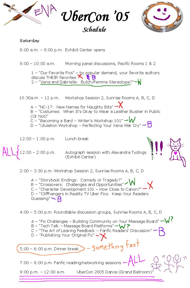 The alarm clock went off, playing a song from the local classic rock station. Tara slowly awoke from her slumber, and reached over to turn the alarm off. The clock's green digital numerals glowed 7:20. She lay back and stretched, then sat up. Anya had drawn the curtains last night, and the room was dark. Tara swung her feet over the side of the bed and walked over to the curtains, pulling them wide so the morning sun suddenly flooded the room. "Ugh, Tara, too bright!" protested a sleepy Anya, pulling her pillow over her head. Tara smiled at her roommate. "Rise and shine, sleepyhead. It's Saturday and your workshop is at 10:30. You made me promise not to let you sleep in." "Oh, all right. 'I'll rise, but I refuse to shine'," Anya quoted Gabrielle as she threw off the pillow, sheets, and blankets. She caught a glimpse of herself in the mirror across the room from her bed and scrubbed her hands through her tousled hair. "Do you want the first shower or the second?" Tara asked. "You go ahead. I'm going to make some coffee and go over my handouts first," Anya said. "And figure out how to turn last night into a scene for one of your stories?" "Oh, I don't know about that," Anya said. "I have a feeling about this one. He's kind of...different. More than just a roll in the haystack." Tara smiled and went into the bathroom. Even Anya isn't immune to Cupid's arrow, it seems. She flipped on the light switch, which bathed the white-tiled room in harsh fluorescent light and started up a noisy fan. She selected toiletries and a washcloth and turned on the shower. When the water had heated up enough, Tara stepped in under the spray and allowed the water to soak through her hair. She squeezed some shampoo into her hand, and set about lathering it up. Lather, rinse, repeat, she thought and she worked up the suds. Does anyone ever actually repeat? I never do, unless I've been camping or something. So why do they put 'repeat' on the instructions? She smiled at the question, and thought she would have to ask amazon_hacker during their next chat session. It was the kind of question the girl would probably either know the answer to, or else she would spend a few minutes searching the internet and would then relay to Tara some of the more outlandish or humorous theories that were out there. No chatting today, I can just ask her in person at noon, Tara though. A knot of anxiety formed in the pit of her stomach as she had the thought. Although she might think I'm kind of weird if that's the first question I have for her. She began to work conditioner through her long hair. The closer the meeting came, the more nervous Tara felt and she wondered if what she was doing was actually a good idea. As long as amazon_hacker was just a personality on the message board and a chatting partner, then she existed in Tara's mind as a quirky, energetic, and fun person who was easy to talk to. And amazon_hacker the internet personality seemed to like Tara quite a bit. But what if she was different in person? What if she was just as shy as Tara was, or loud and obnoxious, and none of the friendly quirkiness came through? Tara knew that it was possible. Though she hadn't met a lot of people through the internet, Anya had met her fair share of friends and/or lovers online. Sometimes people created a personality online that was completely different from who they were in their day-to-day life - either as an escape, or to fulfill some fantasy, or for some other reason. There was no way to tell. Well, not everybody does that, Tara amended her thought as she rinsed the conditioner from her hair. Anya tells me I'm pretty much the same online as I am in real life, and I can't be the only one. And same with her - pretty much what you see is what you get. She reached for the soap and washcloth and finished up her shower. "All done, Anya!" she called as she turned off the shower and wrapped her hair in a towel. Really, there was no way to be certain of anything about amazon_hacker without doing exactly what she was planning to do today - meet her in person. And hey - maybe amazon_hacker was having the same doubts and nervousness as she was. Tara felt a little better as she contemplated this. At least we're on equal footing. The curtains were closed, and only a thin strip of sunlight filtered into the otherwise dark room. The light illuminated the nightstand, which held an untidy jumble of Buffy's martial arts magazine, a half-full glass of water, some crumped-up bits of paper, and the clock radio, which read 8:24. As the morning progressed, the strip of light inched slowly to the right until it fell across Willow's sleeping face. She twitched and frowned. When that didn't make the offending light go away, she waved a hand in front of her face as if shooing a fly. Finally she opened her eyes. "Darn light," she mumbled. She looked to her left, where Buffy lay curled up tucked down in the blankets, with only a tuft of blonde hair peeking out. On the other bed Xander sprawled out on his back, deeply asleep. As she assessed everyone's position, her gaze fell on the clock radio. 8:34 a.m. "OH MY GOD! Wake up, you guys, wake up!" Willow shouted. Buffy jerked awake with her hands held in front of her in a defensive posture. Xander shot up and looked around. "Wha...?" he asked, still half-asleep. "It's 8:34! No, 8:35!" Willow said, looking at the clock. "We overslept! I thought you set the alarm, Buffy," she continued as she examined the clock. "I did set the alarm," Buffy protested, rubbing her eyes. "And I checked it. Why didn't it go off?" Willow asked. She examined the radio. "It should have." "What time did you set it for?" asked Xander. "7:15," Buffy said. "Hmmm," said Xander. "I was having a dream that I was Fred Flintstone working at the quarry, and that the whistle blew for quitting time, so I jumped off my dinosaur and had to throw out my hands for balance as I slid down his neck. I must have hit the alarm clock and turned it off." "And I d
